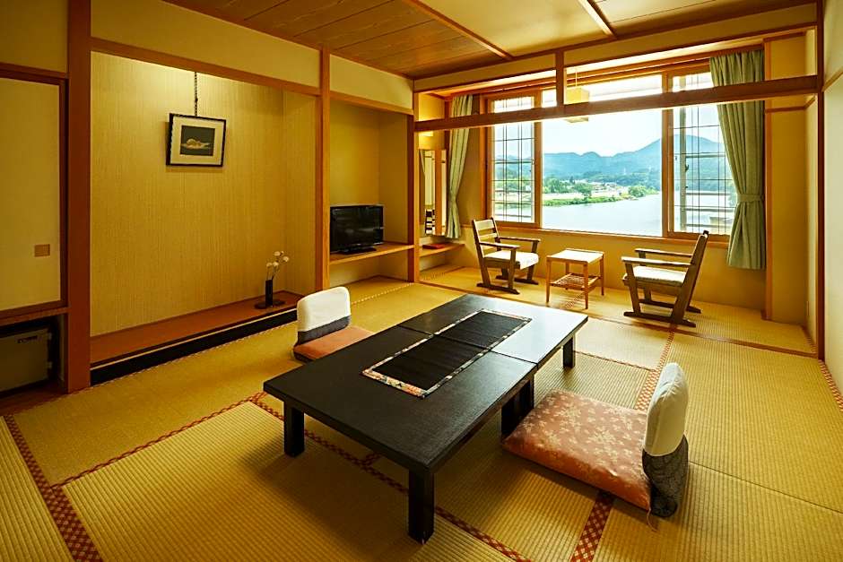 Immerse yourself in a traditional Japanese setting in this spacious quadruple room with stunning mountain and river views. With air conditioning and free toiletries, enjoy comfortable luxury during your stay. Smoking is allowed.